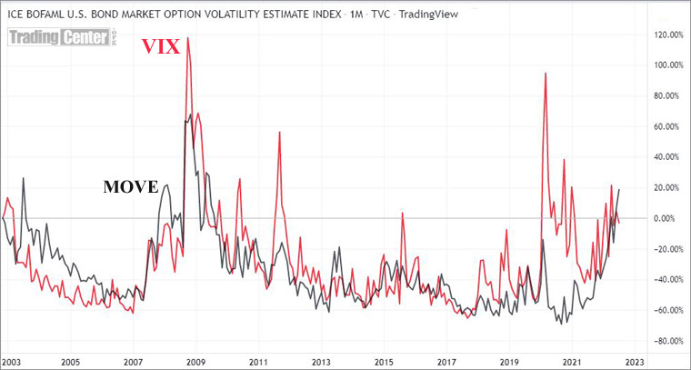 If you see the graph , it shows two volatility indicators. VIX is for equity and Move is bonds today ,Microsoft 10 year bond is there for 10 % yield in Dollars btw, and people still want to buy equities .The risk premium is too high to buy equities but still the liquidity is high there, the markets. The bond volatility was going through the roof, the system . IF you look at bond markets investment grade bonds in dollars are there at 7-8% yield , but still people will continue to speculate . The History will repeat ,like it has for several decades.