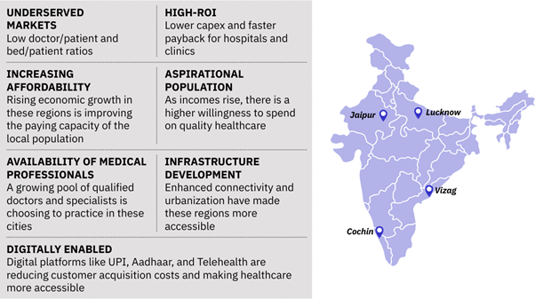 Historically, Tier I cities like Delhi, Mumbai, and Bengaluru have attracted most healthcare investments. But now: