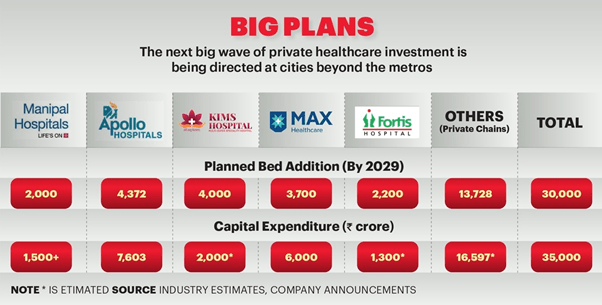 According to industry estimates, private hospital chains plan to add over 30,000 new beds in next 4–5 years, with a capital commitment of around ₹35,000 crore. This is arguably next big wave of private healthcare investment in India—targeted not at metros but at state capitals, industrial hubs & smaller cities.