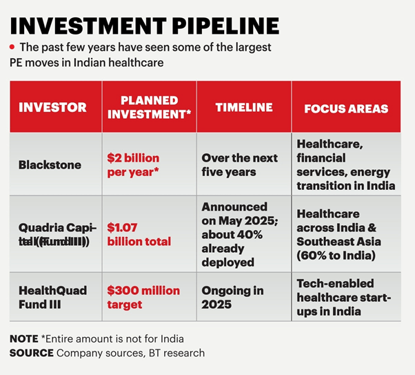 - Blackstone: Invested ₹6,000 crore across hospital assets (Oct 2023).